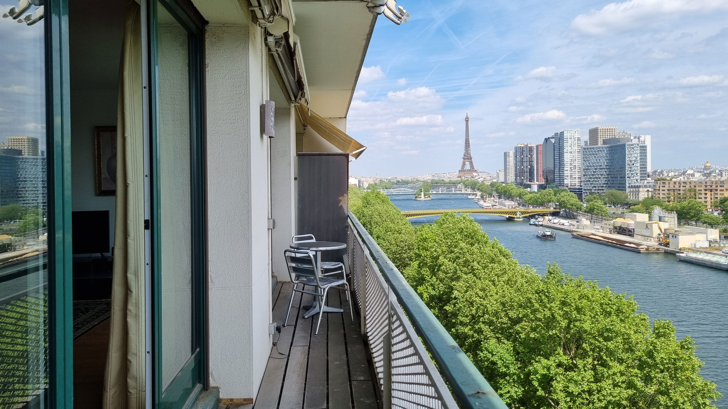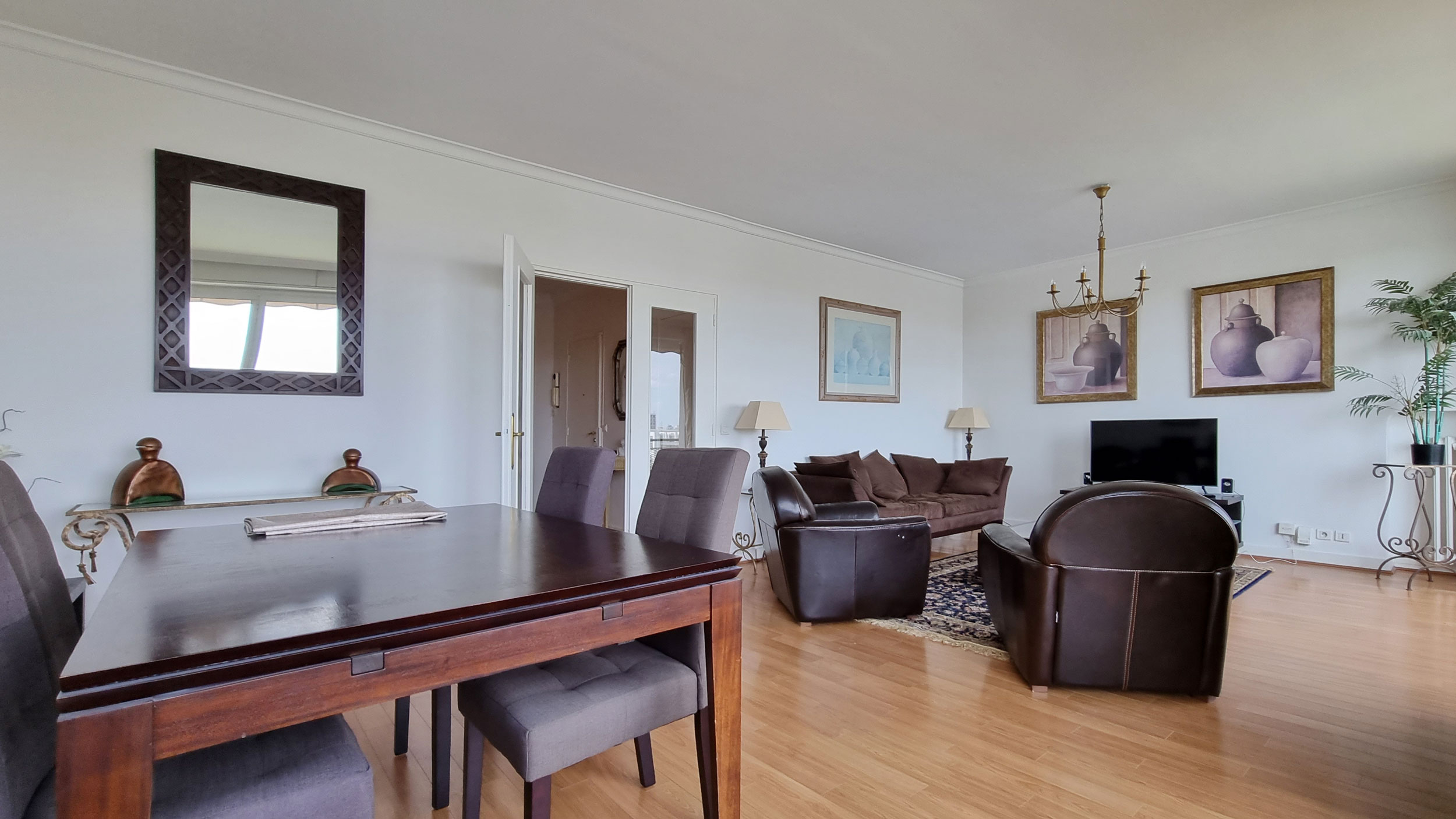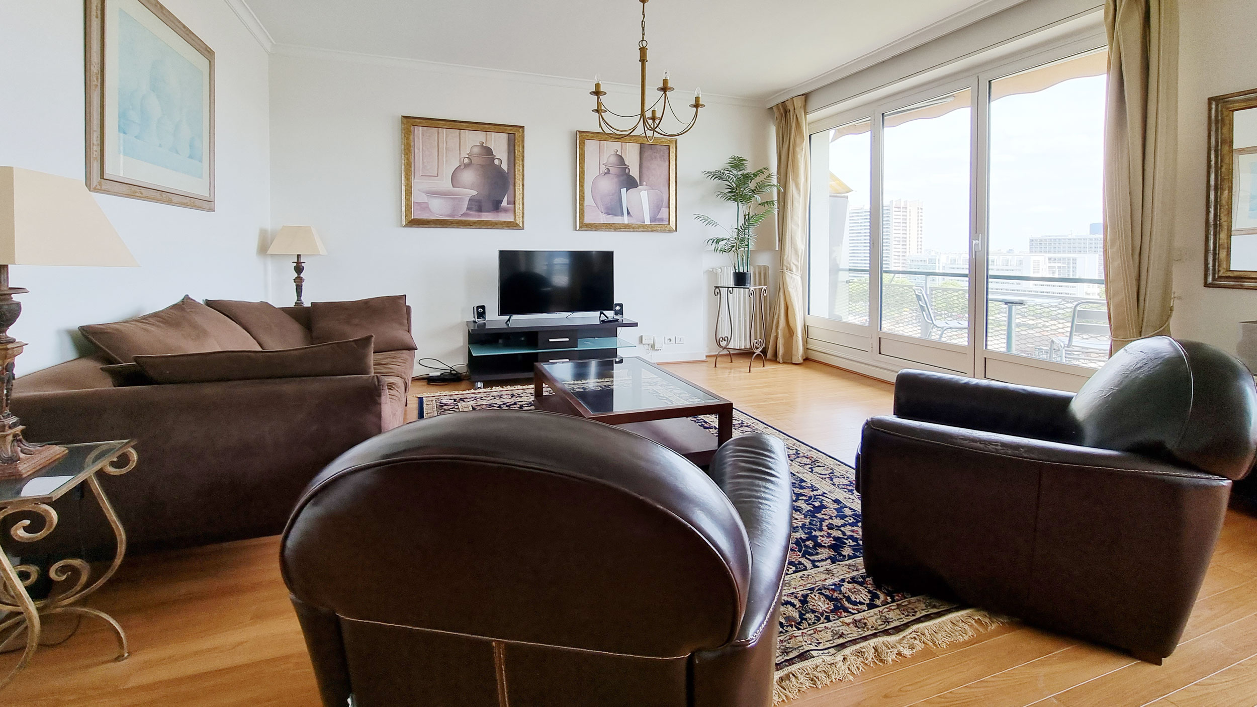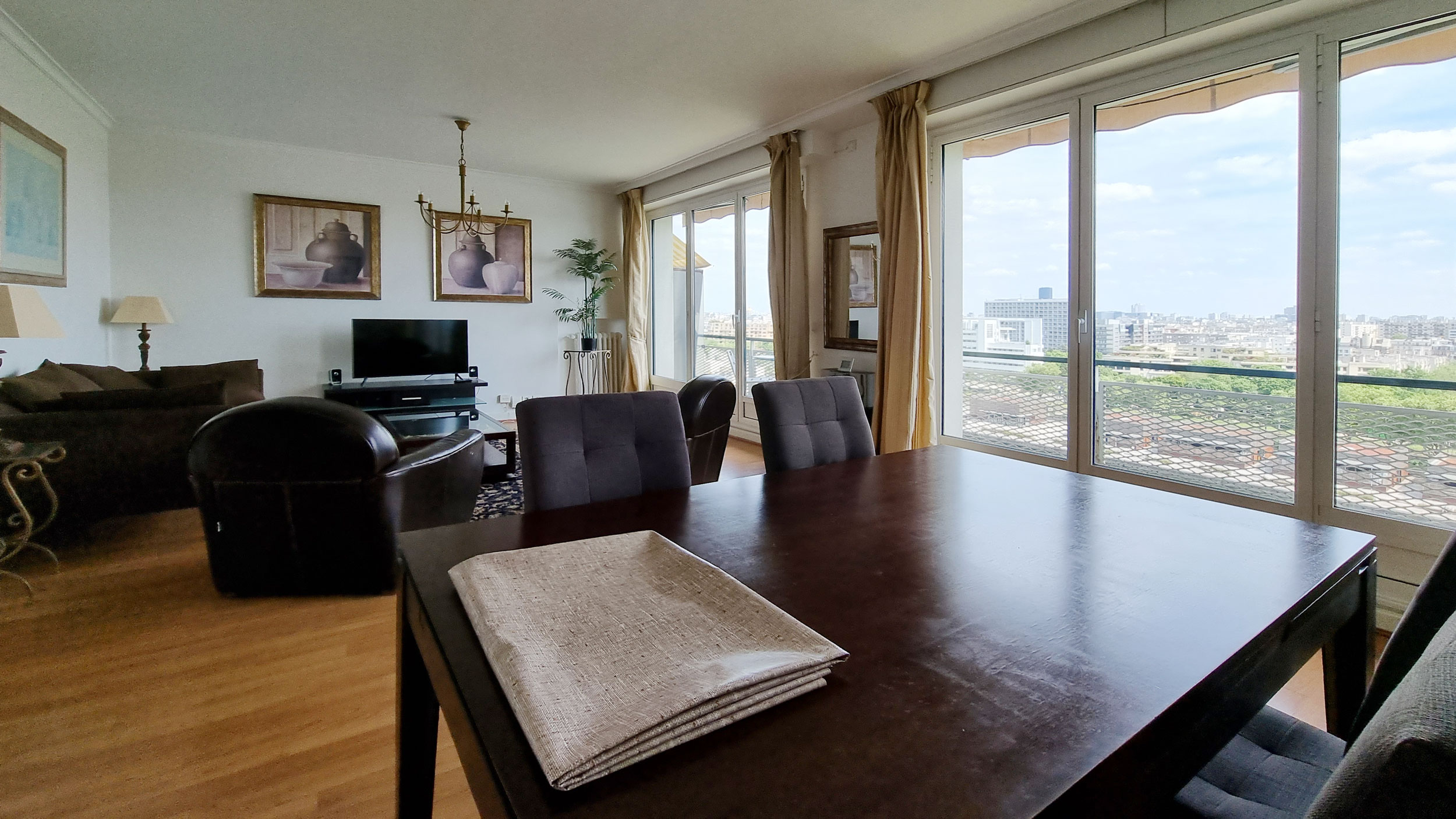 Un appartement meublé au 10ème étage avec ascenseur, 2 balcons et vue sur la Tour Eiffel. Comprenant une entrée, un double living, deux chambres, une cuisine équipée, une salle de bain, un wc et une place de stationnement.
